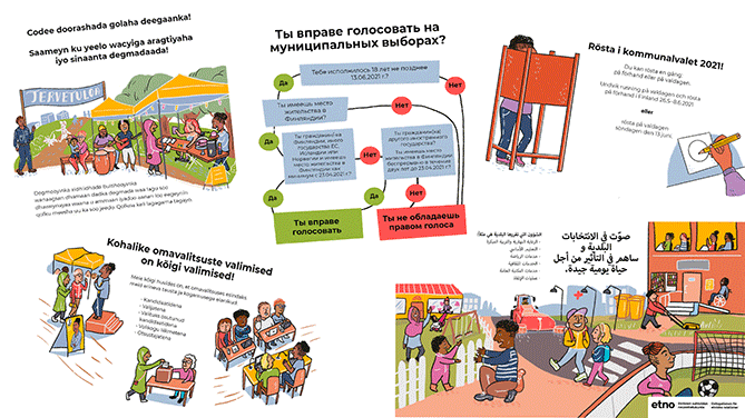 Etnisten suhteiden neuvottelukunnan (ETNO) julkaisemat vaalimateriaalit lisäävät tietoa kuntavaaleista Suomessa seitsemällä kielellä. Visuaalisten materiaalien avulla kannustetaan monikielisiä kuntalaisia vaikuttajiksi ja äänestäjiksi tulevissa kuntavaaleissa.